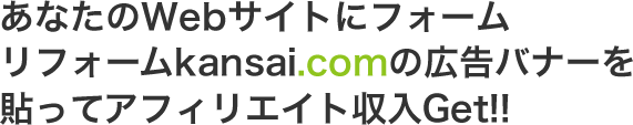 リフォームKansaiでは、アフィリエイトパートナーを募集しています。(パートナー様のWebサイトにバナーを設置して頂き、成果で報酬をお支払いするシステムを予定しています) パートナーの皆さんと共に、リフォームKansaiを盛り上げてゆきましょう!