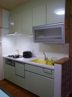 古いキッチンから、吊戸棚の大きなシステムキッチンへリフォームです。 I型のキッチンのエンドパネル代わりにオリジナルのオープン収納を作りました。 お客様からも「エンドパネルの収納がすごく気に入ってるし、重宝してます。お客さんが来たら自慢してます。」と言っていただきホッとしました。