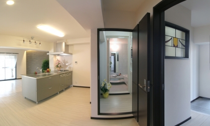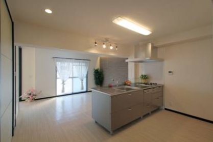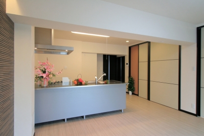 築40年の公団住宅、古く昭和の雰囲気が残る住宅をモダンな空間へとリフォーム。 限られた空間の中でのレイアウトや少しのスペースでも有効に使えるよう、単純なラインで動線もコンパクトにまとめ、動きもスムーズになるようにしました。 一つ一つの部屋が狭く間仕切られ、リビングにまで光りが届かない間取りを変更し、リビングに充分な光りと風が通るようにしました。
