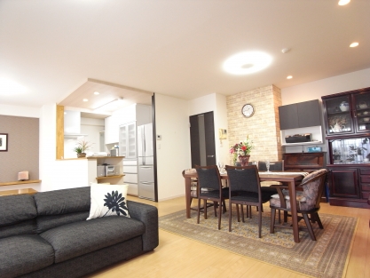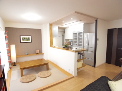 娘様も独立をされご夫婦だけの住まいであったが、休日にお孫さん達を連れて遊びに来られることが多く、大きなテーブルを置いてみんなで食事が出来るダイニングが欲しい。和室がリビングの真ん中にあり使い勝手が悪く狭いので広々と使える間取りに変えて欲しい。 とのご要望で 以前の間取りでは、ご家族3世代が囲める大きなダイニングテーブル、またお手持ちの食器棚のスペースの余裕を持たせるためにはスペースに限界があったため、間仕切り付きの和室をダイニングスペースとして変更し、広く友好的なスペースとして、LDKを一体化させました。