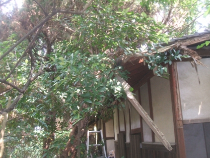 地震により倒壊した門屋を長い間放置していたこともあり、構造材の梁・柱は雨にうたれてかなりの範囲が腐っていました。まず工事は、その腐った構造材を腐っていない構造材を傷めずに撤去することから初めました。構造材撤去完了後には直ちに新設構造材を入れ直しました。工事期間中、建物の倒壊にはかなり神経をつかいました。耐震工事ではなかったのですが、ある程度の地震には耐えられる構造材を使用した上、雨にうたれないような配慮もしました。完了後、お施主様から笑顔で「長年の懸案事項が解決できました」との喜びのお言葉をいただきました。