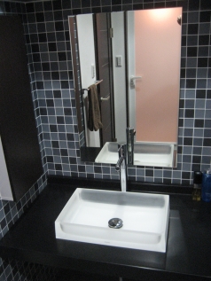 お客様のご要望より、洗面は別注カウンターをご提案いたしました。 センターミラーの裏側より間接照明と壁面の装飾壁の明暗など、人に優しいライティング効果をねらいました。 落ち着いた配色感でバランスを整えることで、高級感とハイセンスの中に、アジアンテイストと遊び心を融合した洗面空間となっています。