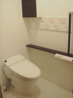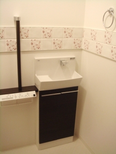 ウォシュレットの水漏れから、新しい便器へ取替えを検討することになりました。タイルの好きなお客様で、また、玄関が桧のえんこ板貼りなので、玄関との一体感も作りながら、素材をタイルにしてほしいとのことでした。