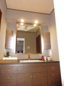 お客様のご要望より、洗面は別注カウンターをご提案いたしました。 センターミラーの裏側より間接照明と壁面の装飾壁の明暗など、人に優しいライティング効果をねらいました。 落ち着いた配色感でバランスを整えることで、高級感とハイセンスの中に、アジアンテイストと遊び心を融合した洗面空間となっています。